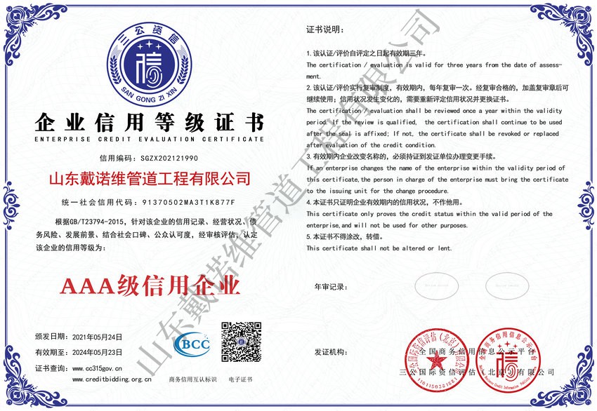 管道非開挖修復(fù)工程服務(wù)企業(yè)資質(zhì)證書