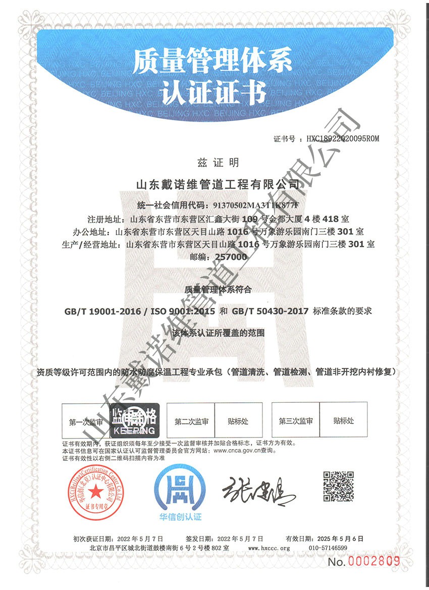 管道非開(kāi)挖修復(fù)工程服務(wù)企業(yè)資質(zhì)證書(shū)