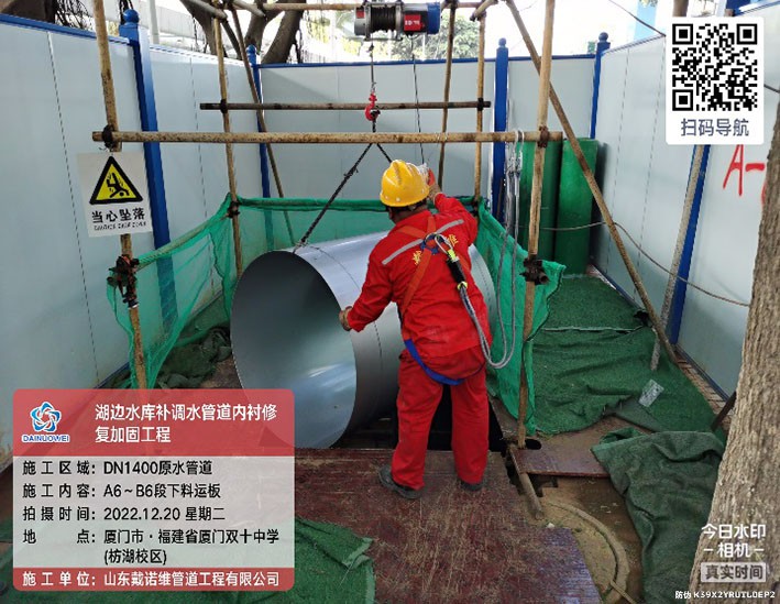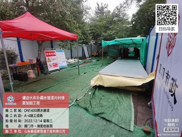 4.項目概況:湖邊水庫DN1400補調水管道全長8709.5m,起點為高殿水廠。湖邊水庫補調水管道設計輸水能力20萬m3/d,是保障廈門市島內原水應急供應的重要管道。湖邊水庫補調水管道補調水管道自2010年1月投入運行,部分路段管道多次發(fā)生漏水或破管事件,因此本次對爆管頻繁發(fā)生段管道予以修復。該現(xiàn)狀管管徑為DN1400,采用預應力II 級鋼筋混凝土管(以下簡稱混凝土管)、鋼管和球墨鑄鐵管埋地鋪設,其中原管材為鋼管或球墨鑄鐵的管段本次不予以修復。由于混凝土管段多次發(fā)生管道破裂、脫節(jié)及沉降事件,因此本次對混凝土管段予以修復,全長3568.55m。采用非開挖方式內襯不銹鋼更新修復。